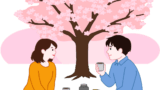 工事モグラの親子が穴掘りの途中で、満開の桜を眺めながらひと休みしているイラストです。