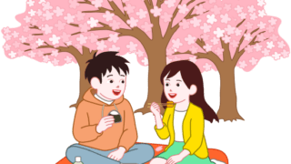 お花見ピクニックお花見ピクニックのイラストについて満開の桜の木の下で、お花見ピクニックを楽しむ若い男女(カップル・夫婦)のイラストです。お弁当(おにぎり・玉子焼き・おかず)を食べながら、仲睦まじく談笑している様子を描きました。春の行楽、お花...