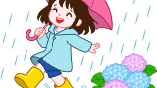 梅雨 梅雨を楽しむ子供のイラスト|雨の日の水たまり遊び・長靴・あじさい・レインコート