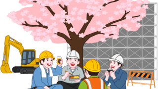 お花見 桜の下でランチを食べる建設作業員のイラスト|お花見と昼休憩